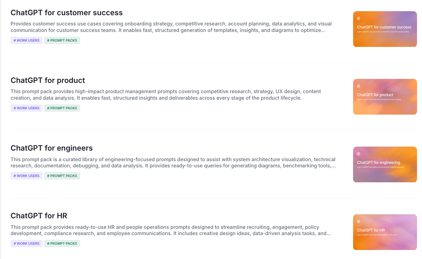 Profissionais já usam IA de formas isoladas, mas muitas vezes perdem tempo ajustando prompts ou testando diferentes abordagens. Os Prompt Packs trazem curadoria oficial da OpenAI, organizados por função, garantindo eficiência imediata.