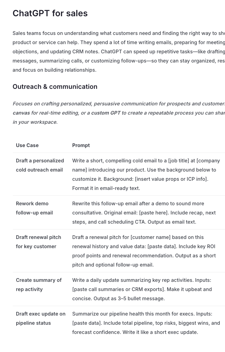 - Vendas: instruções para prospecção, análise de concorrência, personalização de pitches e estratégias comerciais academy.openai.com.